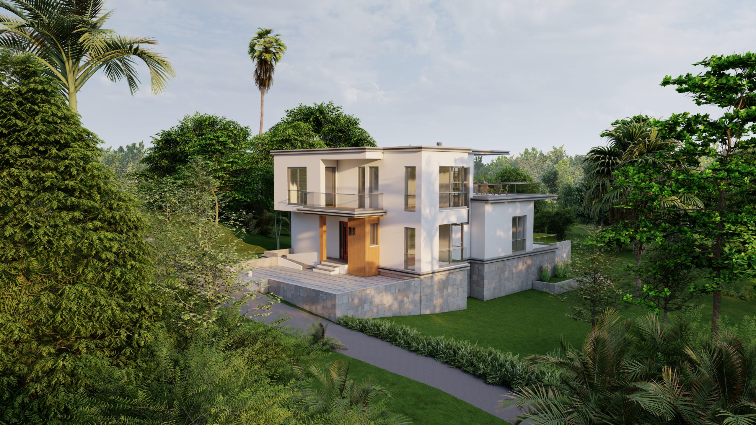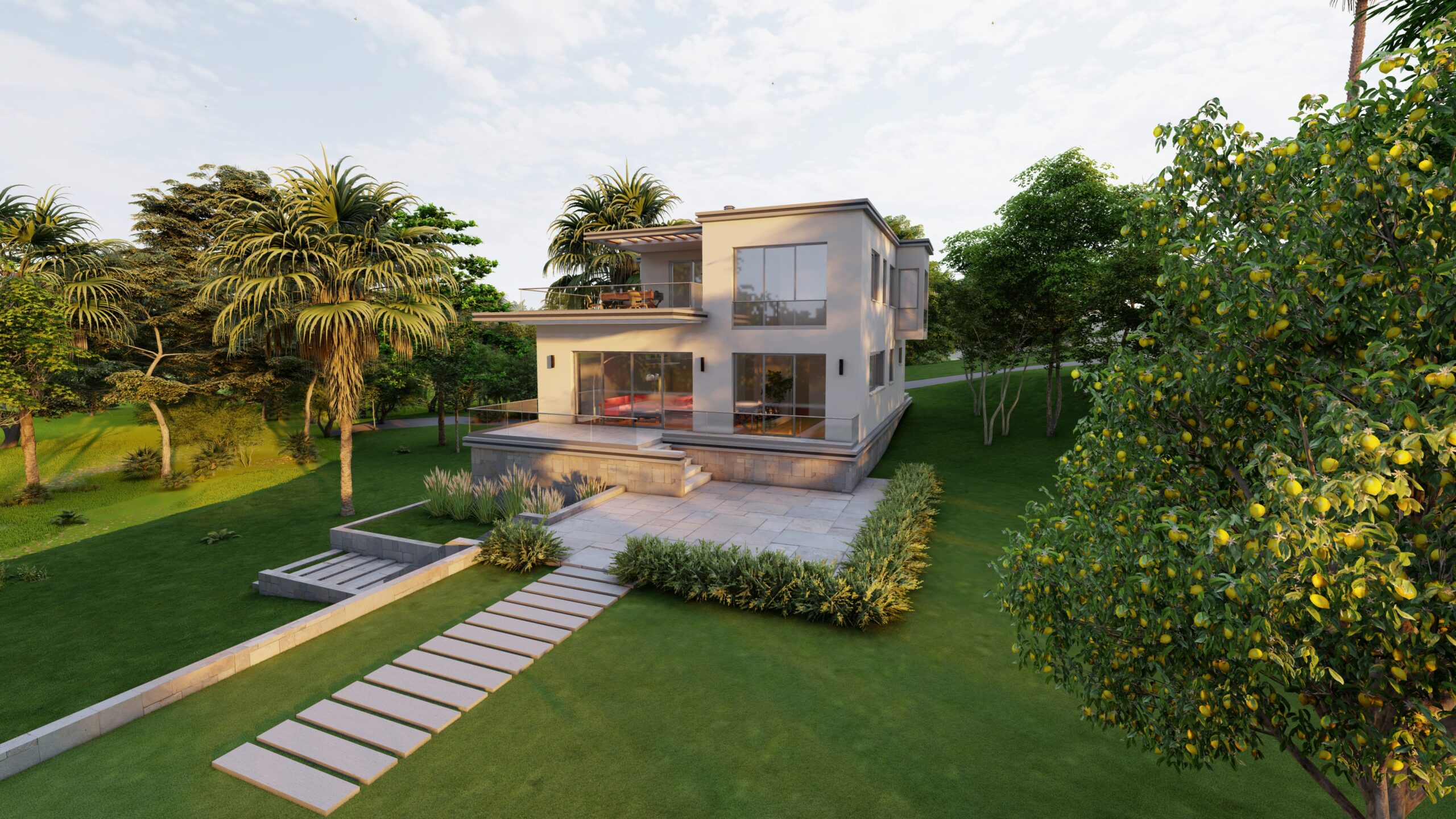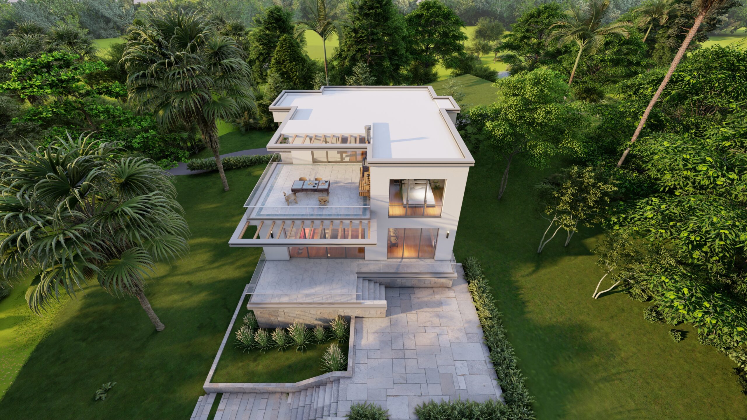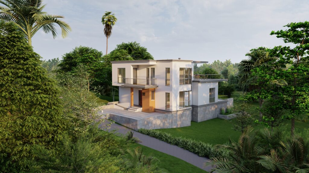 Zemin katta, kütle içinde ve dışında oluşturulan kot farkı mekânlar arasında hem ayrışmayı hem de akışkanlığı sağlar. Giriş holü ve düşey sirkülasyonun iç mekânda konumlanışı, binaya girer girmez ön bahçe ile kesintisiz ve güçlü bir görsel bağ kurulmasına olanak verir. Birinci katta önerilen yarı açık ve açık kullanıma olanak veren teras sayesinde yeşil doku ile üst kottan da ilişki kurulması sağlanır. Bu teras, genişliği ve barbekü alanı ile keyifli zaman geçirilecek kalabalık toplaşmalara cevap verecek nitelikte tasarlanmıştır.
