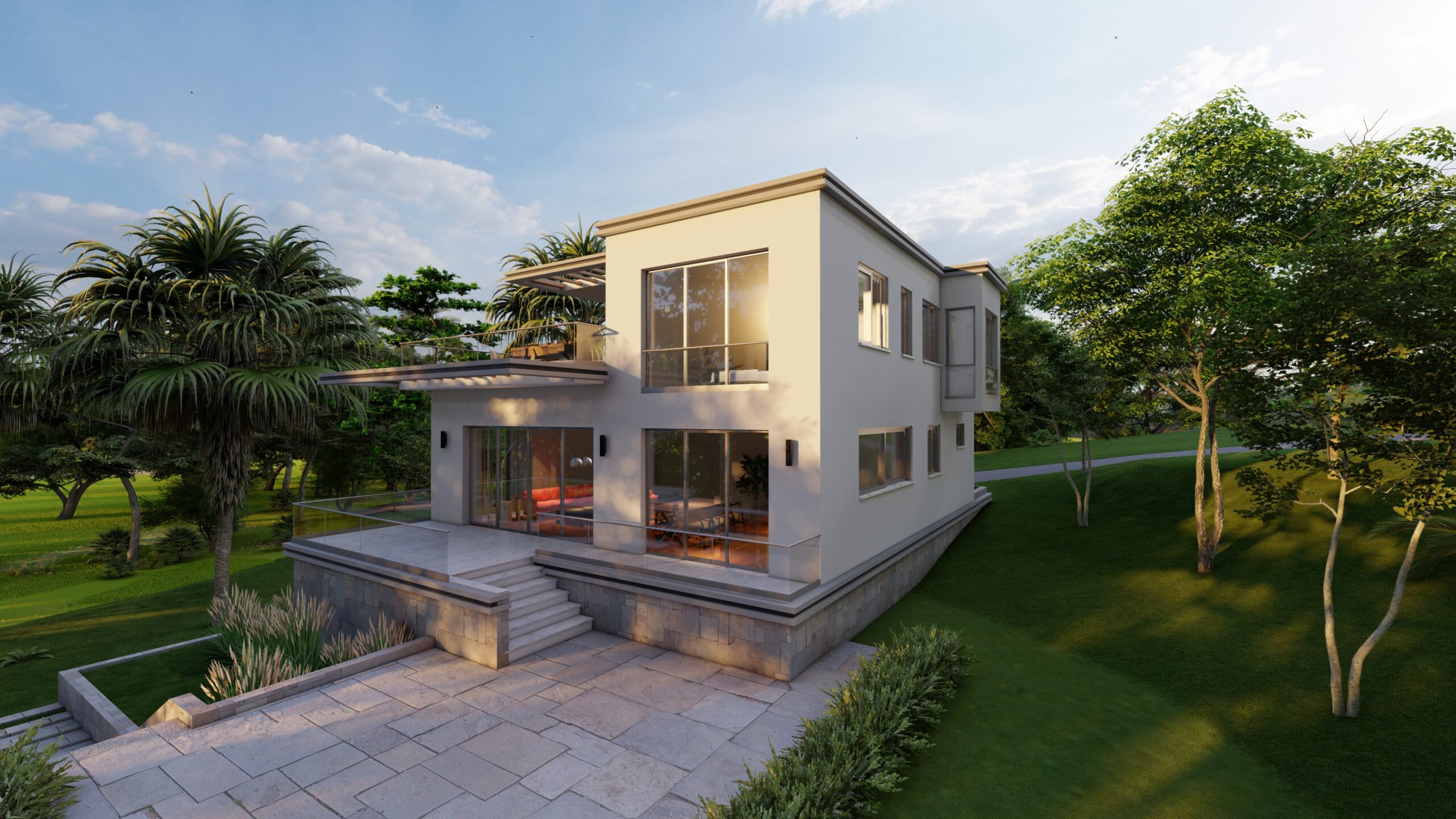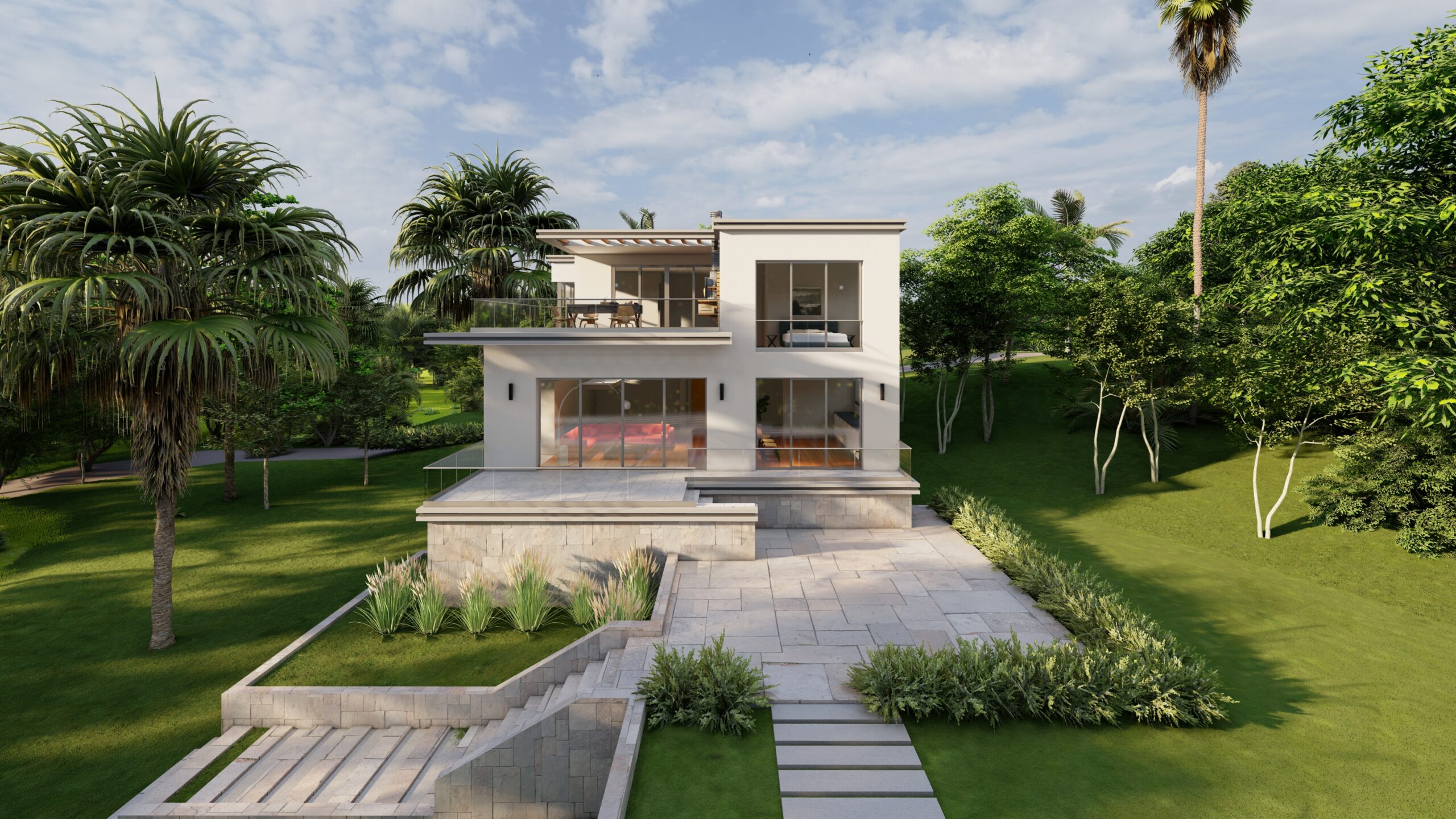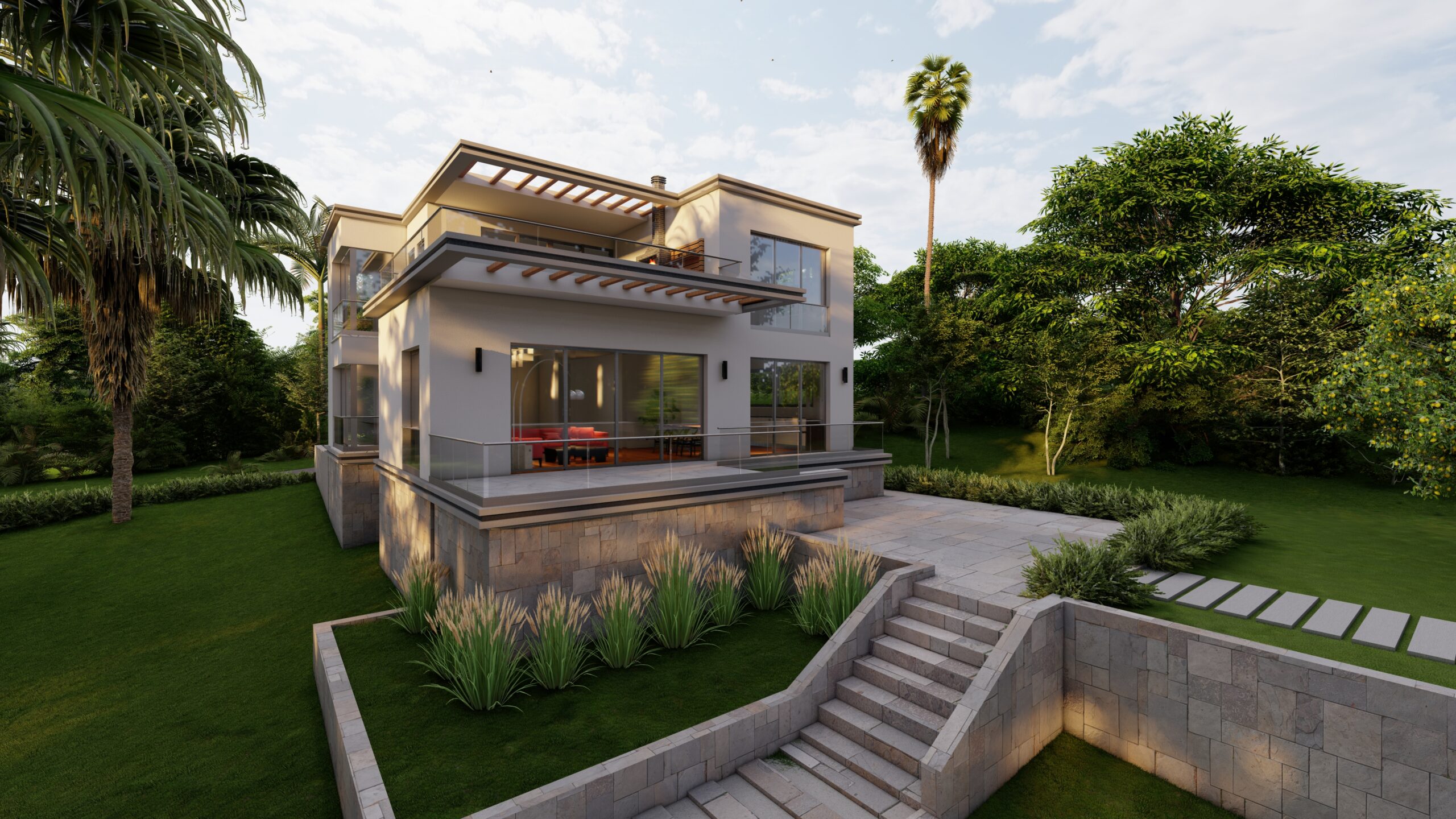 Zemin katta, kütle içinde ve dışında oluşturulan kot farkı mekânlar arasında hem ayrışmayı hem de akışkanlığı sağlar. Giriş holü ve düşey sirkülasyonun iç mekânda konumlanışı, binaya girer girmez ön bahçe ile kesintisiz ve güçlü bir görsel bağ kurulmasına olanak verir. Birinci katta önerilen yarı açık ve açık kullanıma olanak veren teras sayesinde yeşil doku ile üst kottan da ilişki kurulması sağlanır. Bu teras, genişliği ve barbekü alanı ile keyifli zaman geçirilecek kalabalık toplaşmalara cevap verecek nitelikte tasarlanmıştır.