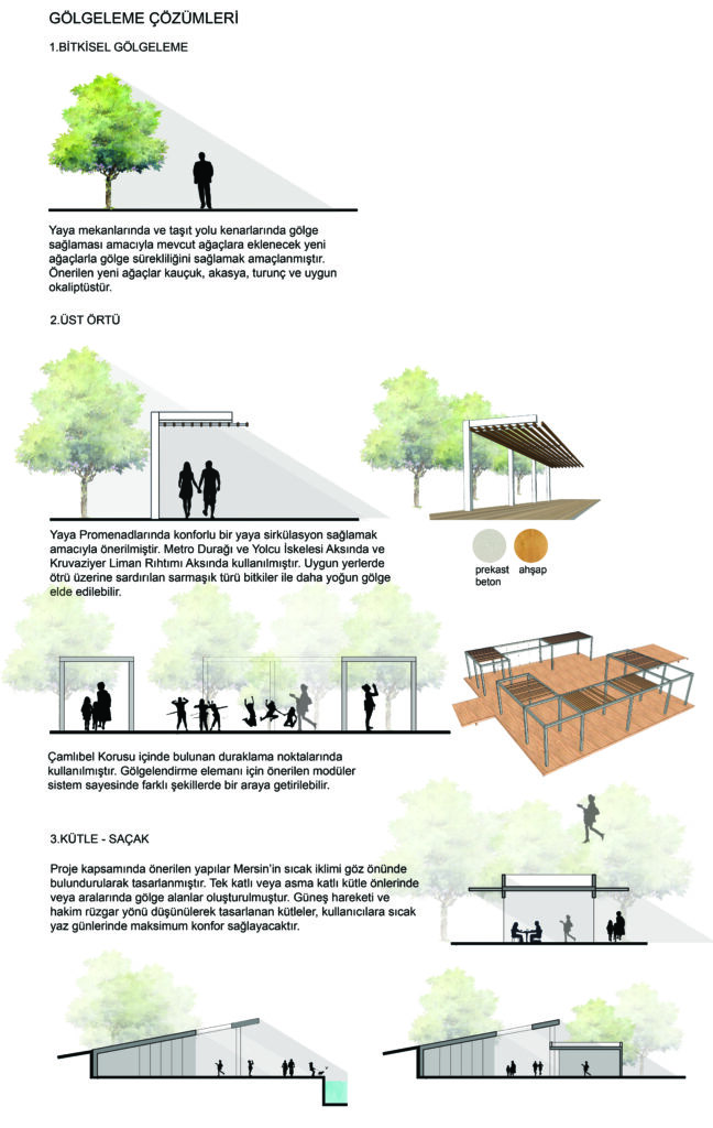 Günümüzde kentin denizle ile olan ilişkisi sınırlıdır. Özellikle kıyıda yapılan dolgu ve yeşil alan düzenlemesi nedeniyle denizi seyretme dışında bir faaliyet yapılamamaktadır. Doğal kıyı kesimleri ise kentin kullanımına kapalıdır. Bu tasarım önerisinde kıyı tipolojisinde (kesitlerinde) bir çeşitlilik sağlanmaya çalışılmıştır. İç turizm potansiyeli, kentlilerin rekreasyon gereksinimi, kurvaziyer liman projesi, deniz ulaşımı projesi ile birlikte ele alınarak çağa uygun bir iskeleler kenti Mersin imgesi oluşturulmaya çalışılmıştır. Önerilen iskelelerin her biri kentin iç bölgelerinden, konut ve ticaret bölgesinden, ulaşım odağından denize ulaşan bir sokak veya caddenin denize temas ettiği noktada konumlandırılmıştır.