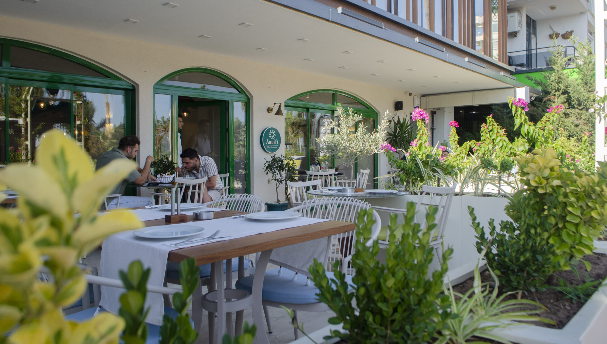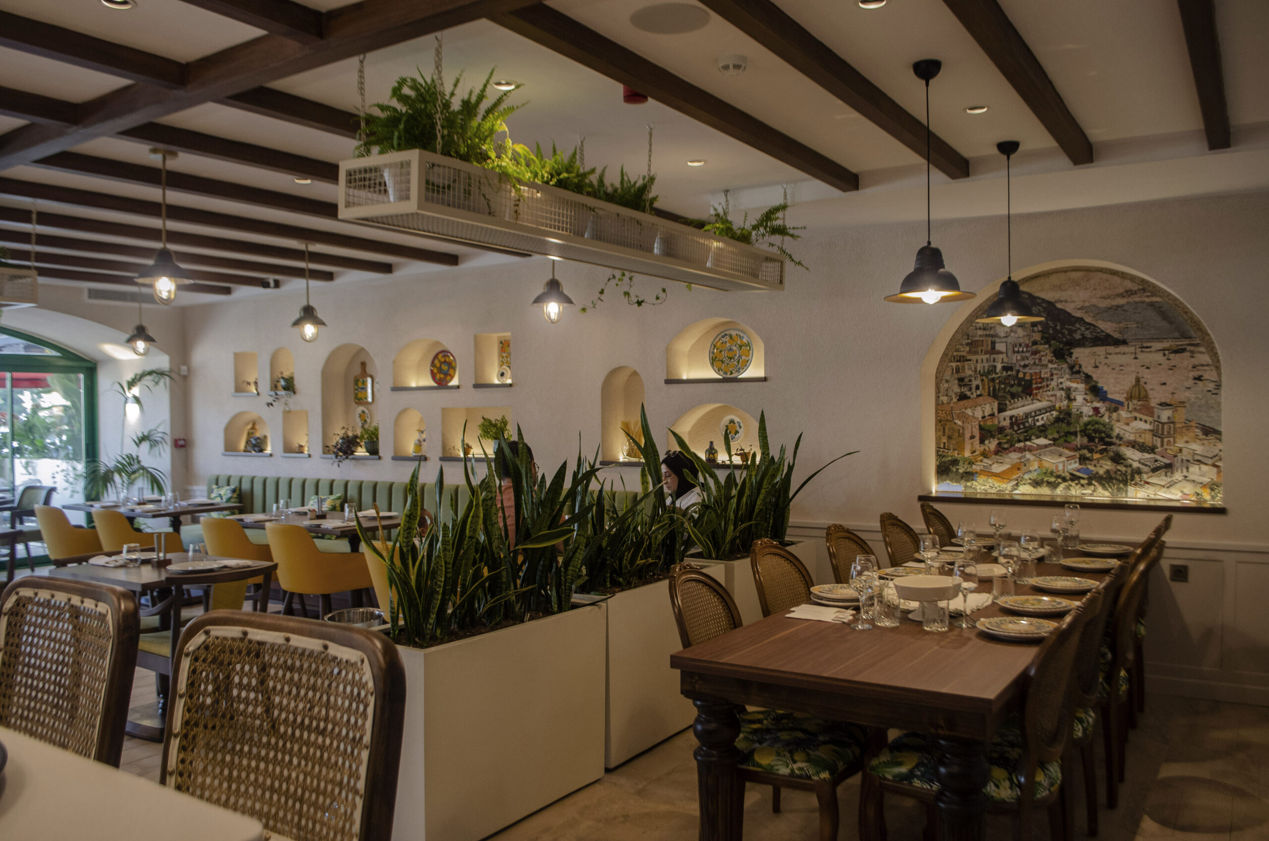 Amalfi İtalian Restaurant, Pozcu semtinde, sahil şeridinde bir ofis kütlesinin zemin katında bulunuyor. Şehrin ilk İtalyan restoranı olan Amalfi, iç mekân tasarımında geleneksel İtalyan mimarisi öğeleri, malzeme ve mekânsal kurgularının yeniden yorumlanmasını hedeflemektedir. Amalfi’nin eğimli yamaçlarında, Mersin’in ise bereketli ovalarında yetiştirilen limonlar iki Akdeniz kentini aynı kokuda buluşturur. Bu ortaklıktan ilhamla oluşturulan renk paleti; sarı, yeşil, toprak tonlarının ahşap, seramik ve dokulu sıva yüzeyleriyle bir araya geldiği, hem İtalyan kırsal mimarisinin doğal dokusuna hem de Akdeniz coğrafyasının canlı, neşeli atmosferine referans verir.