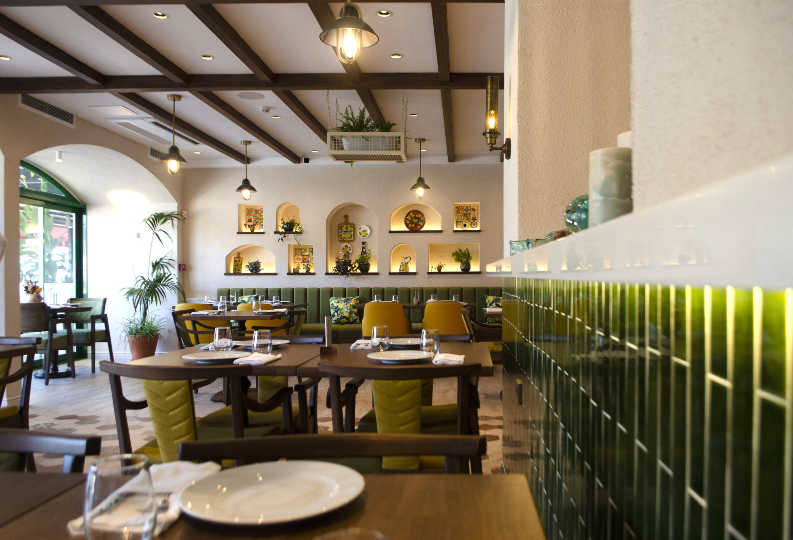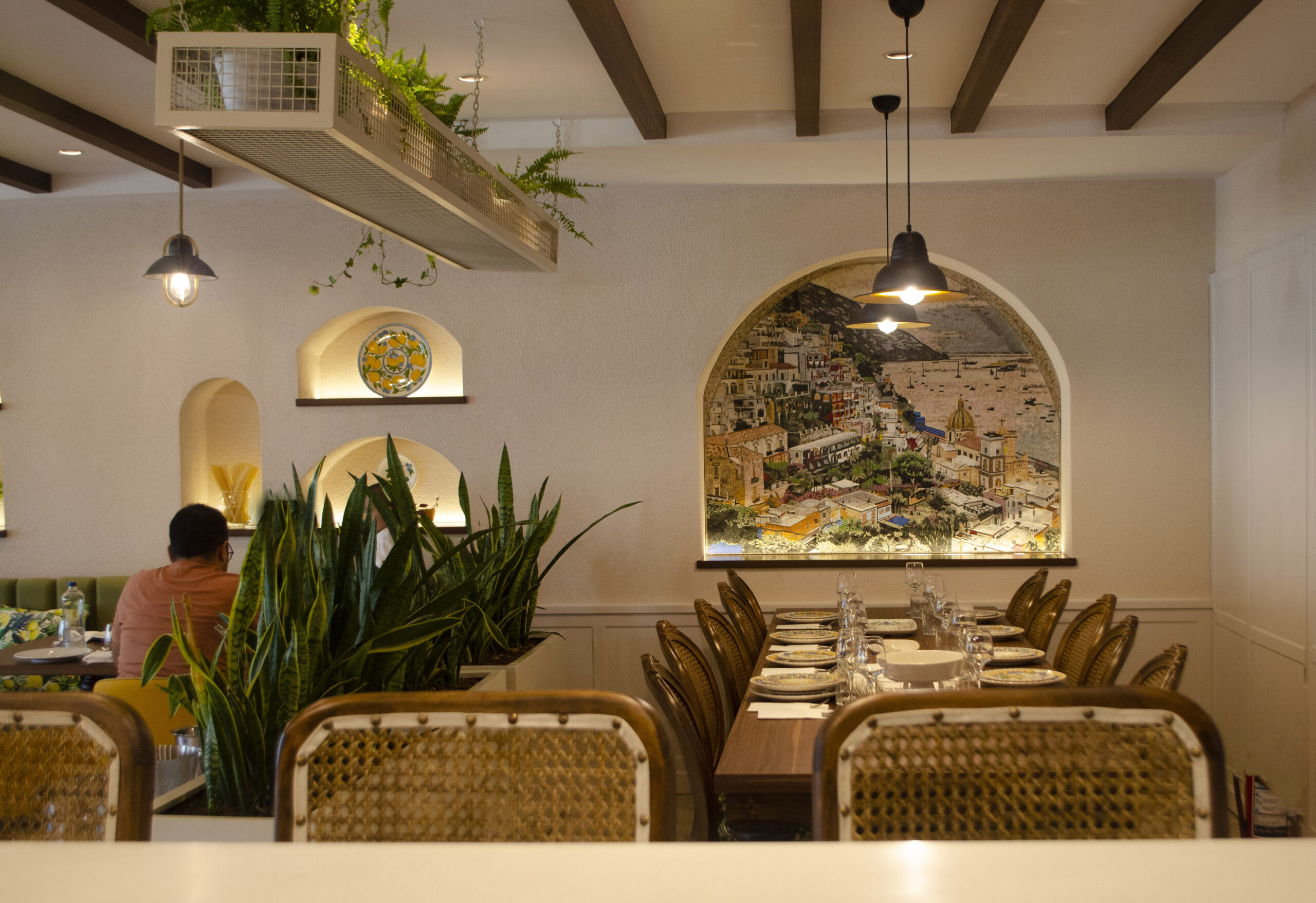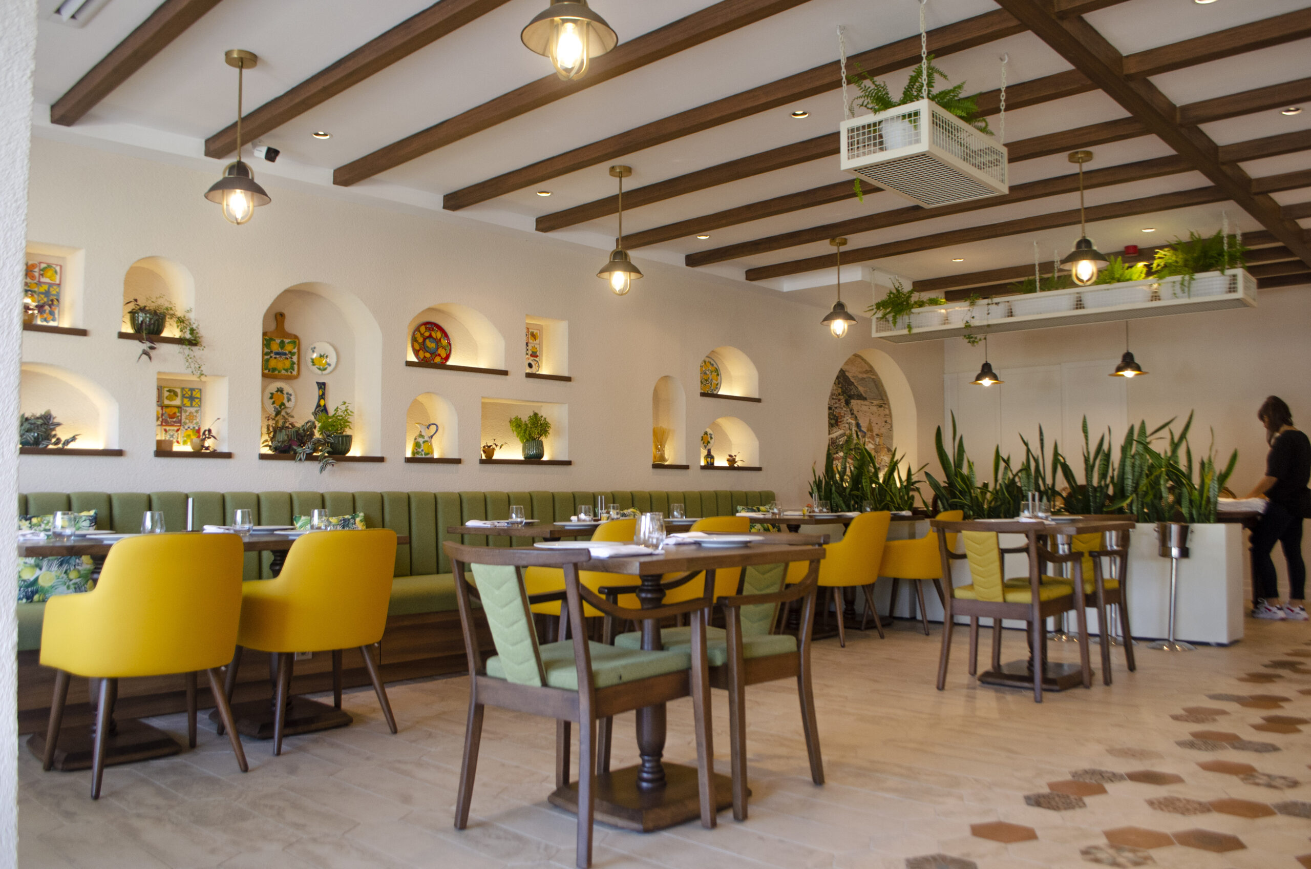 Girişin solunda bulunan duvar her ne kadar tesisat şaftları ve taşıyıcı kolonlar sebebiyle kesintisiz bir yüzey imkânı vermese de restoran içinde sürekliliği olan tek duvardı. Bu sebeple restoranın bir kenarını güçlü bir şekilde tanımlayan, nişlerle kurgulanmış bu duvar; hem Amalfi seramiklerinin sergilendiği bir arka plan, hem de önündeki oturma düzeni ile mekânı biçimlendiren birincil öğe olma niteliğini taşıyor. Restoranın ortasında bulunan düşey taşıyıcı bar bölümünün sınırını belirleyen yapısal eleman oldu. Giriş cephesini şekillendiren tonoz kurgusunun iç mekânda tekrarı ile mimari dil bütünlüğü sağlanırken aynı zamanda bar kısmına güçlü bir vurgu da yapılmış oldu.