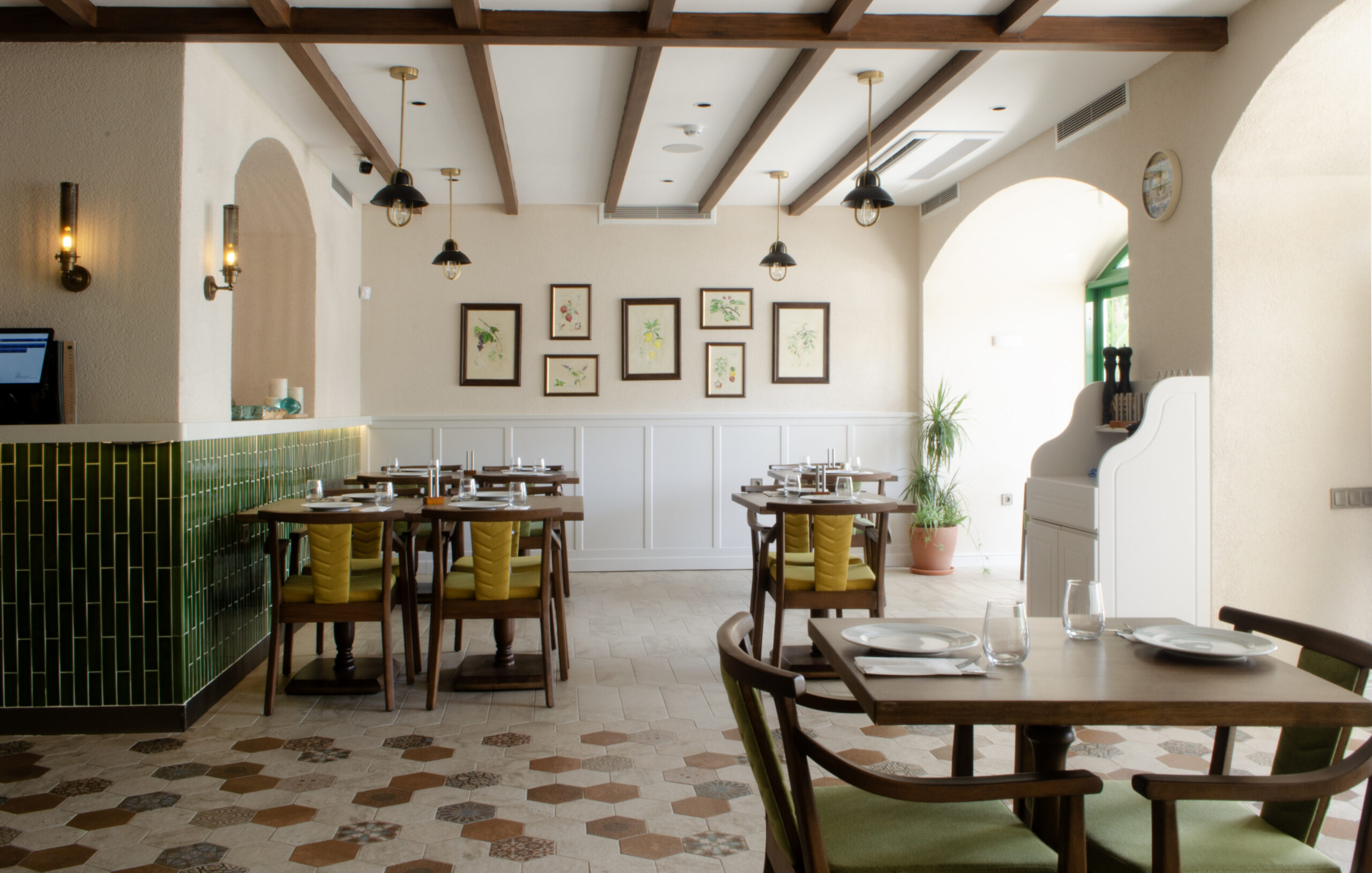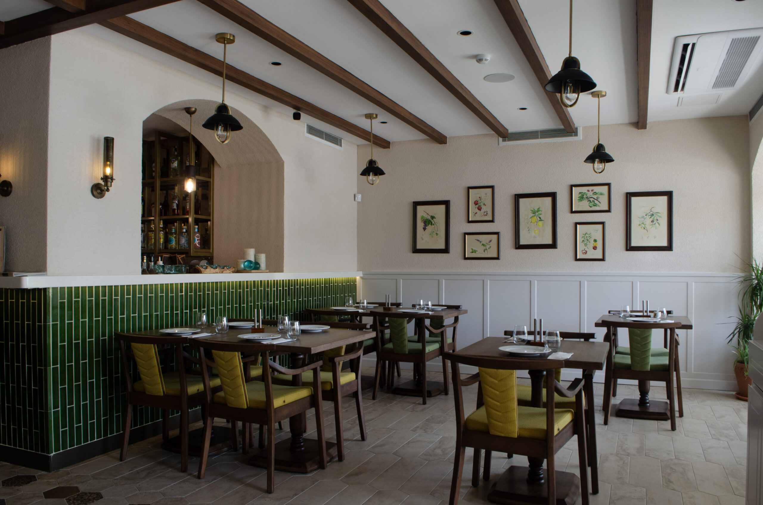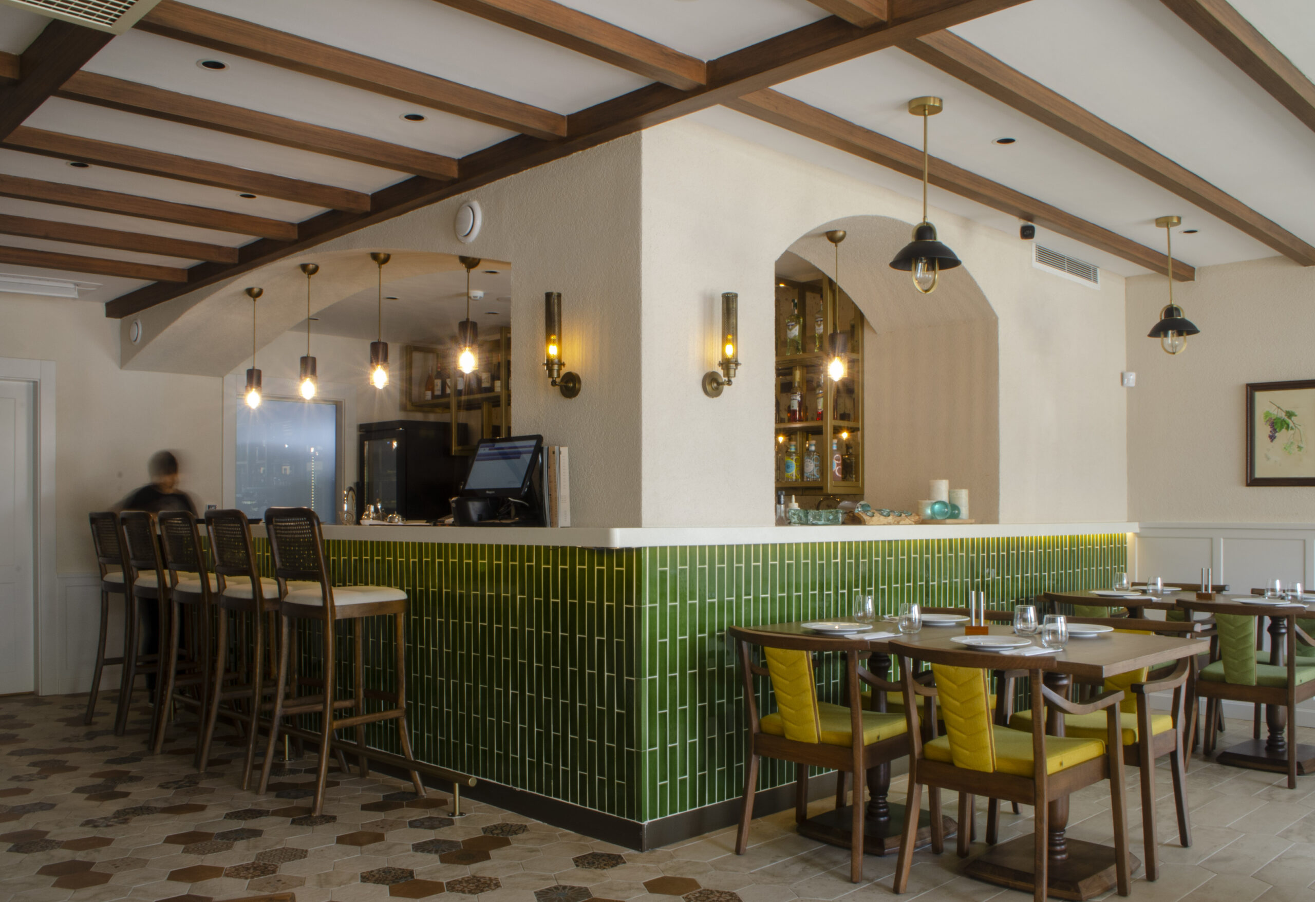 Girişin solunda bulunan duvar her ne kadar tesisat şaftları ve taşıyıcı kolonlar sebebiyle kesintisiz bir yüzey imkânı vermese de restoran içinde sürekliliği olan tek duvardı. Bu sebeple restoranın bir kenarını güçlü bir şekilde tanımlayan, nişlerle kurgulanmış bu duvar; hem Amalfi seramiklerinin sergilendiği bir arka plan, hem de önündeki oturma düzeni ile mekânı biçimlendiren birincil öğe olma niteliğini taşıyor. Restoranın ortasında bulunan düşey taşıyıcı bar bölümünün sınırını belirleyen yapısal eleman oldu. Giriş cephesini şekillendiren tonoz kurgusunun iç mekânda tekrarı ile mimari dil bütünlüğü sağlanırken aynı zamanda bar kısmına güçlü bir vurgu da yapılmış oldu.